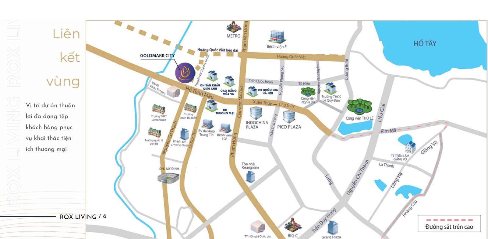 ROX Center sở hữu vị trí chiến lược ngay trung tâm phát triển phía Tây Hà Nội, được bao quanh bởi cộng đồng dân cư đông đúc với hơn 45.000 cư dân trong bán kính 1km, cùng với các tuyến giao thông hoàn thiện như Vành Đai 3,5 và Vành Đai 4.